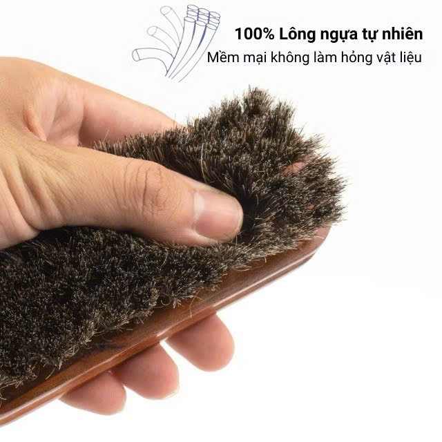 - Bàn chải lông ngựa sợi mềm, khác với các chất liệu bàn chải sợi tổng hợp nhựa cứng, vừa làm sạch bề mặt vừa đảm bảo da không bị tổn thương hay trầy xước. Kết hợp với xi ra đánh giày sẽ đem lại các sản phẩm da của bạn bề mặt sáng bóng như mới.