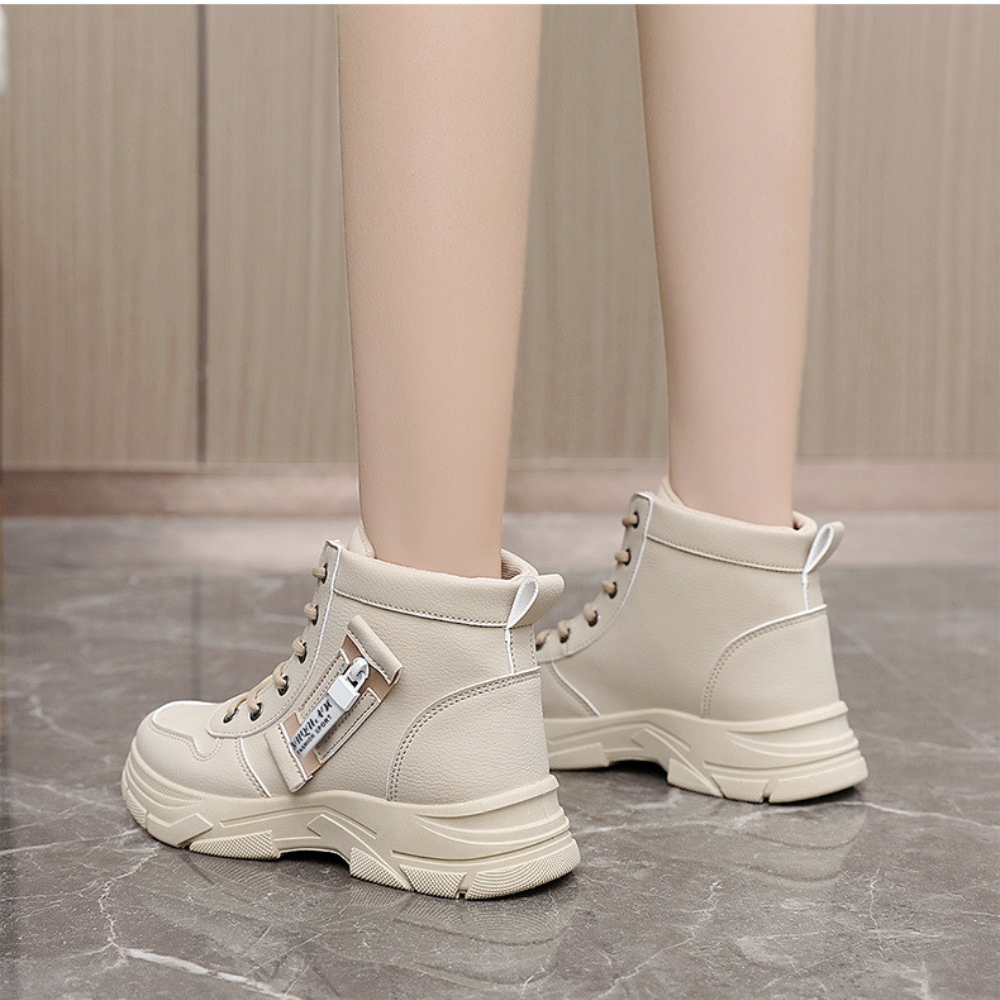 - Giày bốt phong cách sneaker chất liệu mềm mại, quai trong lót mút và mặt lót dày dặn giúp nàng thoải mái và tự tin vận động ngày dài. Đế cao su cao 4 cm, giúp nàng khéo léo nâng chiều cao.Tông màu kem nâng tone da tạo hiệu ứng thon gọn và kéo dài đôi chân. Với phong cách năng động và đảm bảo giữ ấm cho đôi chân, thiết kế phù hợp cho những chuyến du lịch mùa thu hay những chuyến vui chơi dã ngoại.
